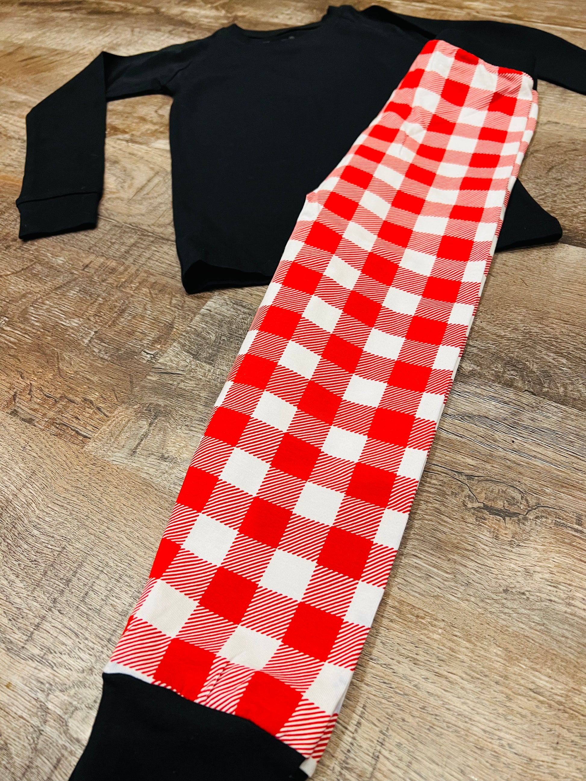 Black top and red plaid bottoms.