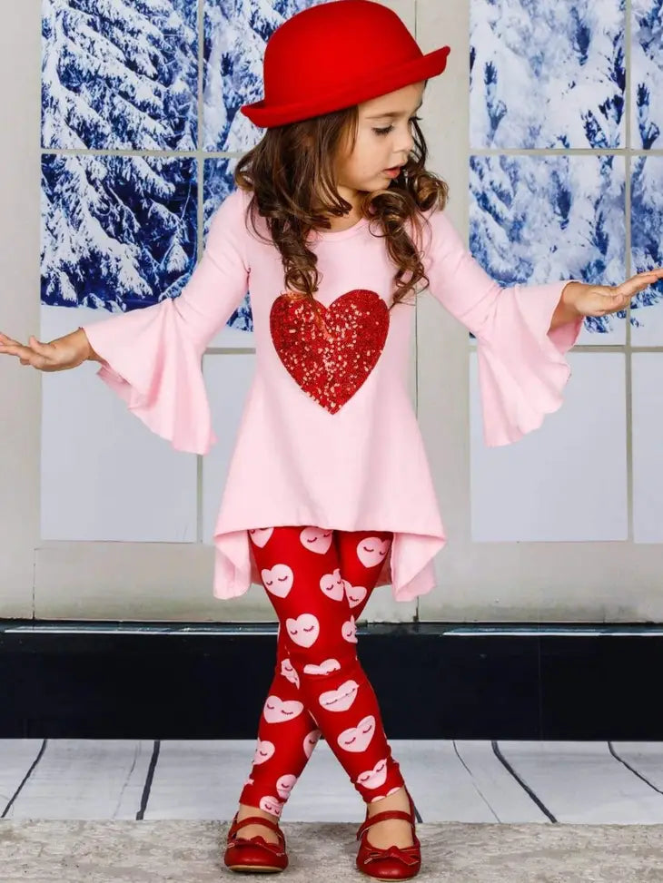 * The set features a hi-lo tunic with sequin heart applique with 3/4 length flounce sleeves and matching heart print leggings